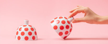 Banner of health checkup. Two white porcelain lids with red dots on a pink background. Female hand opens right lid. copyspace. Concept of Breast Cancer Awareness Month.