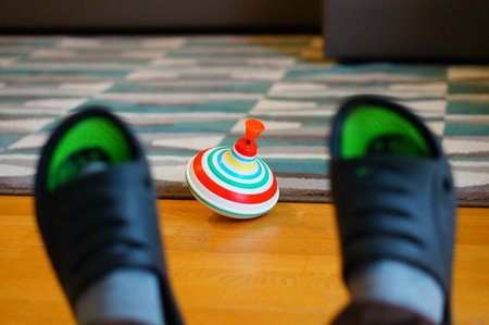 A colorful spinning top dances on a wooden floor, casting shadows as sunlight streams through the window. The room has a warm, nostalgic feel, perfect for moments of joy and play.