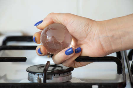 A womans hand holds a small ball of earth over a gas burner at home, a global gas problem, gas refusal