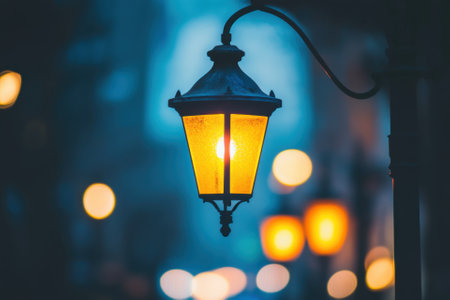 A charming vintage street lamp casts a warm glow in a bustling city, creating an enchanting scene with blurred bokeh lights that evoke a sense of tranquility and beauty.