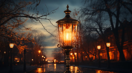 A vintage street lantern casts a warm glow along a tranquil urban street at twilight, highlighting the peaceful atmosphere and charming architecture.