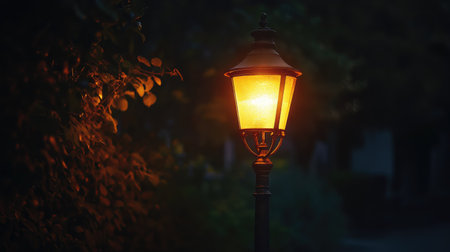 A vintage street lamp casts a warm, inviting glow in a dark night scene, surrounded by misty foliage. This serene image captures the essence of tranquility and solitude.