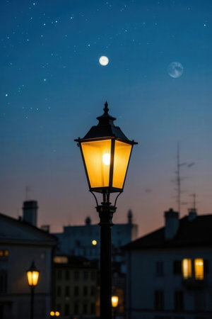 A vintage street lamp casts a warm glow in an urban environment, creating a serene and inviting atmosphere against a dark sky backdrop.