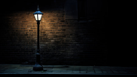 A vintage street lamp casts a warm glow against a textured brick wall at dusk. The soft light illuminates the urban scene, creating a charming and elegant atmosphere.