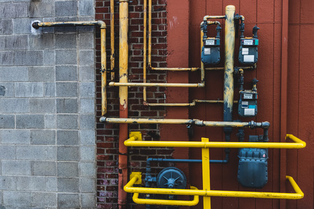 Row of natural gas meters with yellow pipes on building brick wall