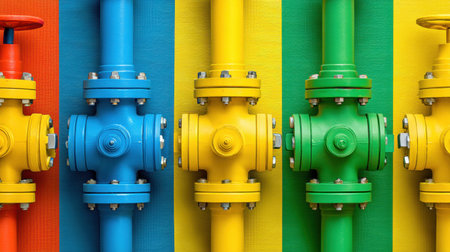This image showcases colorful industrial pipes with valves arranged in a striking sequence against a bright backdrop, ideal for engineering and design projects.