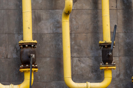 Yellow gas pipelines run along a weathered gray wall, unveiling a blend of modern engineering and industrial aesthetics. Valves create connections, reflecting the energy system's intricate design.