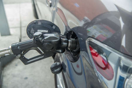 Pumping gasoline fuel in black car at gas station , Gas pump nozzle. Fuel gasoline car in gas station, to fill the machine with fuel.