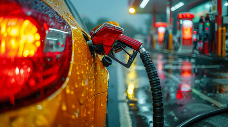 A person holds a fuel nozzle while refueling a car at a gas station on a rainy day. The droplets on the vehicle emphasize the challenging weather conditions.