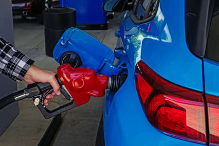 Fill the car with fuel. The car is filled with gasoline at a gas station. Gas station pump. Man refueling gasoline with fuel in a car, holding a nozzle. Limited depth of field. Blurred image Close-up.