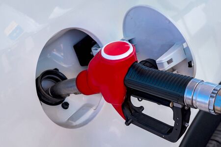 Refueling a car with fuel. A red fueling gun is installed in the gas tank of a white passenger car.