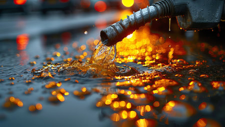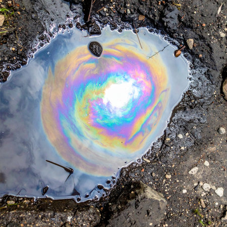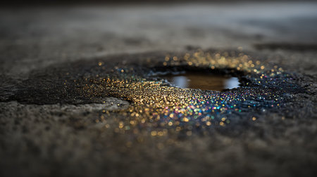 A multi-colored gasoline or oil slick creating a bright shine on wet asphalt, demonstrating environmental problems