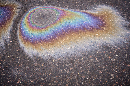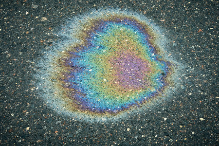 Rainbow oil spill on wet asphalt surface creating colorful pollution texture and abstract background
