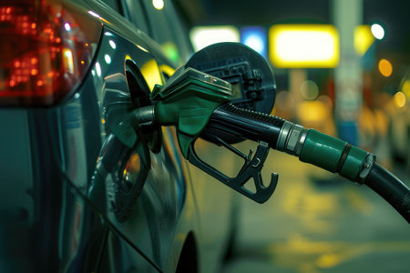A striking close-up image of a fuel pump nozzle being inserted into a car's gas tank at a busy refueling station, highlighting urban convenience.