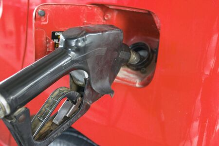 Close-up image of a red fuel pump nozzle inserted into a car's fuel tank, capturing the essence of daily refueling at a busy gas station.