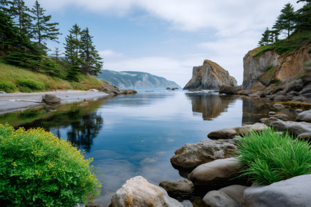 Serene coastal cove featuring still water reflecting sea stacks, cliffs, and evergreen trees under a clear sky