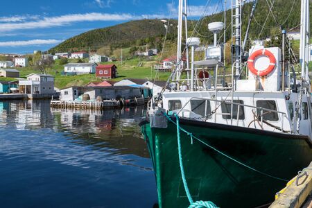 Fishing boats docked in villages' harbours in Bonavista. Newfoundland, Canada. Newfoundland fishing villages see boats at rest for the day on calm coastal water.