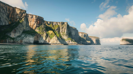 A dramatic coastal landscape bathed in the warm glow of golden hour. Layered sandstone cliffs rise majestically from the calm sea, their textured surfaces highlighted by the low-angled sunlight. Patches of green vegetation and scattered pine trees cling to the cliff tops, adding a touch of life to the rugged terrain. The sky transitions from a soft grey to a vibrant orange and yellow as the sun dips towards the horizon, casting a warm, serene ambiance over the scene. Small clouds catch the...