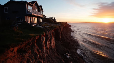 A coastal home perched on cliff, sunset reflecting on water