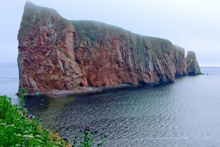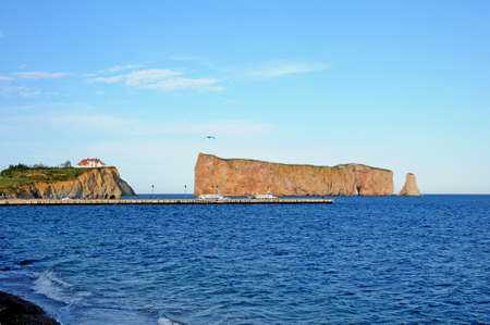 View of Percé Rock, a huge sheer rock formation in the Gulf of Saint Lawrence on the tip of the Gaspé Peninsula in Québec, Canada, off Percé Bay.