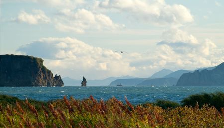 The picturesque coast of Kamchatka against the blue sky. The hills with steep slopes are covered with green vegetation. Ripples on the surface of the Pacific Ocean.