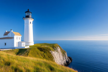 Scenic view of a white lighthouse on a grassy cliff overlooking a vast blue ocean under a clear sky