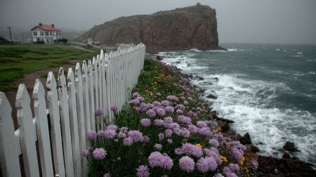 A scenic coastal view featuring a white picket fence, a large cliff, and the turbulent ocean under a cloudy sky.