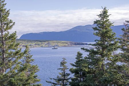 View of Rocky Harbour in Newfoundland, Canada with fir trees in foreground