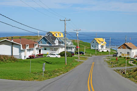 View of a road leading to a beautiful modern town on the Atlantic Ocean Coast during a hazy day. Taken in Perce, Quebec, Canada.