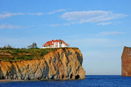 Perca ? Rock at Gaspa ? Peninsula in Quebec, Canada FORMED of limestone and shale with Bonaventure Iceland in the background