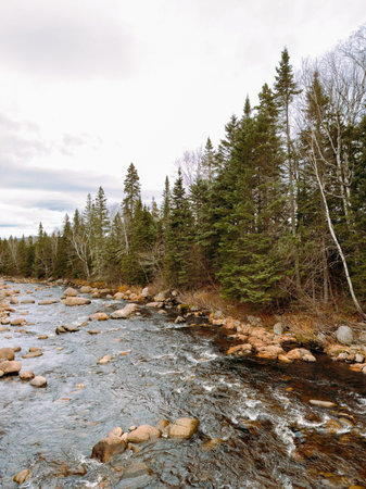 Mountain river in autumn. Quebec, Canada. River in the boreal forest.