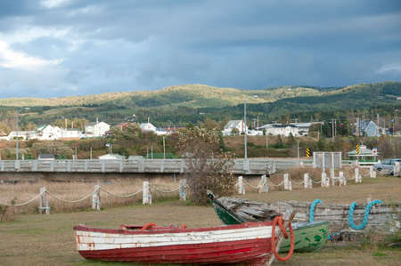 wrecked fishing boat and village, scenic view before a storm. Mont Ste Anne ,Gaspesie, Canada