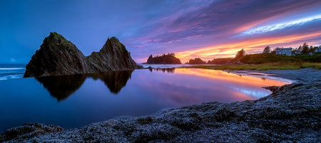 Striking panoramic landscape view of a rocky Atlantic Ocean Coast during a vibrant sunrise. Taken at Beachside, Newfoundland and Labrador, Canada.