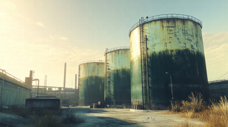 Large oil storage tanks stand in an industrial area, surrounded by rusty structures and wild plants, under a bright sky during daylight.