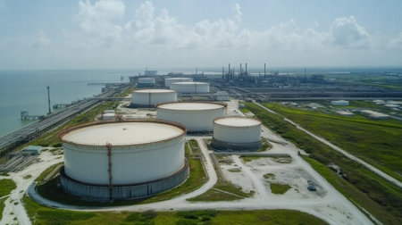 Large oil storage tanks are positioned in an industrial facility next to the coastline, surrounded by green fields and factories.