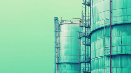 Green industrial tanks filled with biofuel blend seamlessly with the environment at a coastal refinery, symbolizing sustainable energy production