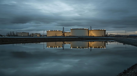This image captures industrial storage tanks illuminated at dusk, creating a serene reflection on a calm water surface, showcasing modern infrastructure.