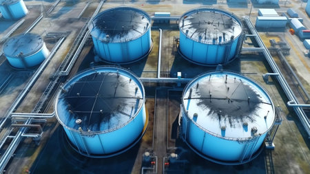 Aerial top view of oil tanks of petrochemical industry, gas storages of chemical petroleum factory. Concept of fuel, refinery plant, company, technology, energy. Generative AI