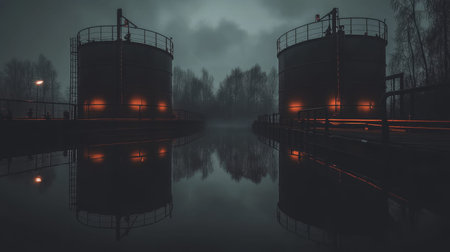 Gas storage tanks glowing at night, reflecting in the water, creating an industrial landscape
