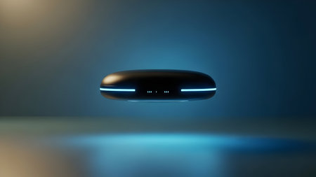Sleek black floating device with glowing blue neon lights. Advanced technology concept against a gradient background.