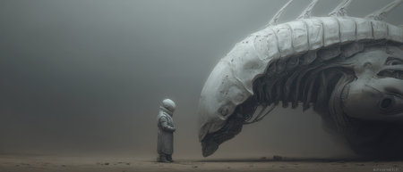 A small figure in a space suit stands before a massive ancient creature in a foggy desolate environment evoking awe and curiosity.