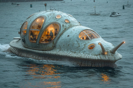 An advanced research vessel glides gracefully through ocean depths, surrounded by ethereal blue light. Its sleek design and glowing elements hint at technological innovation, inviting exploration