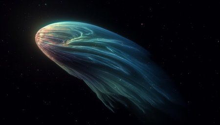 bright comet with a vibrant tail streaking through the cosmos, surrounded by a bright star cluster generative ai