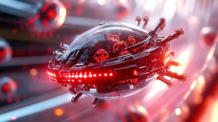 Futuristic spaceship travels through luminous red and black tunnel, displaying sleek design with energy effects. Concept of science fiction, space exploration, technology advancement.