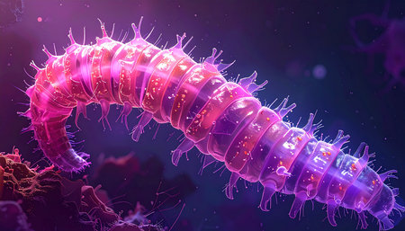 A macro shot of a centipede. A caterpillar crawling on the ground in the forest. Generative AI illustration