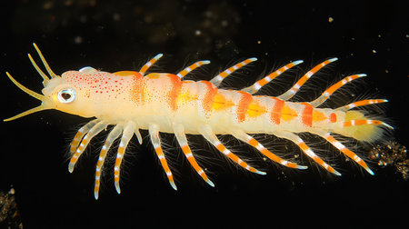 A vibrant marine worm with a translucent, segmented body, adorned with bright orange bands, fine red speckles, numerous feathery legs, and a distinctive tail.
