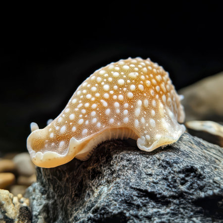 A vibrant sea slug with a distinctive pattern navigates over a rocky surface, showcasing its unique texture and coloration in a nighttime underwater environment.