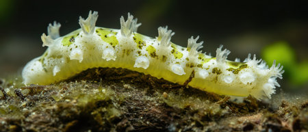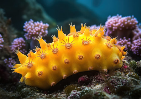 A yellow sea cucumber with numerous spines on its body, and anemones in the background. Underwater photography in the style of [Artist name]. --ar 7:5 --v 6.1 Job ID: f96e6767-779a-4825-9a04-d532b03e2fd5