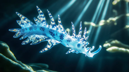 A captivating blue sea creature with spiky features gracefully floats in an enchanting underwater environment illuminated by soft rays of light.