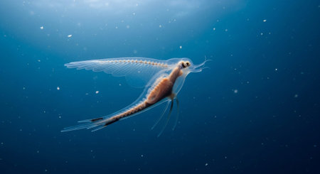 A captivating marine creature floats gracefully in deep blue water, showcasing its transparent body and ethereal features. The scene exudes tranquility and mystery.